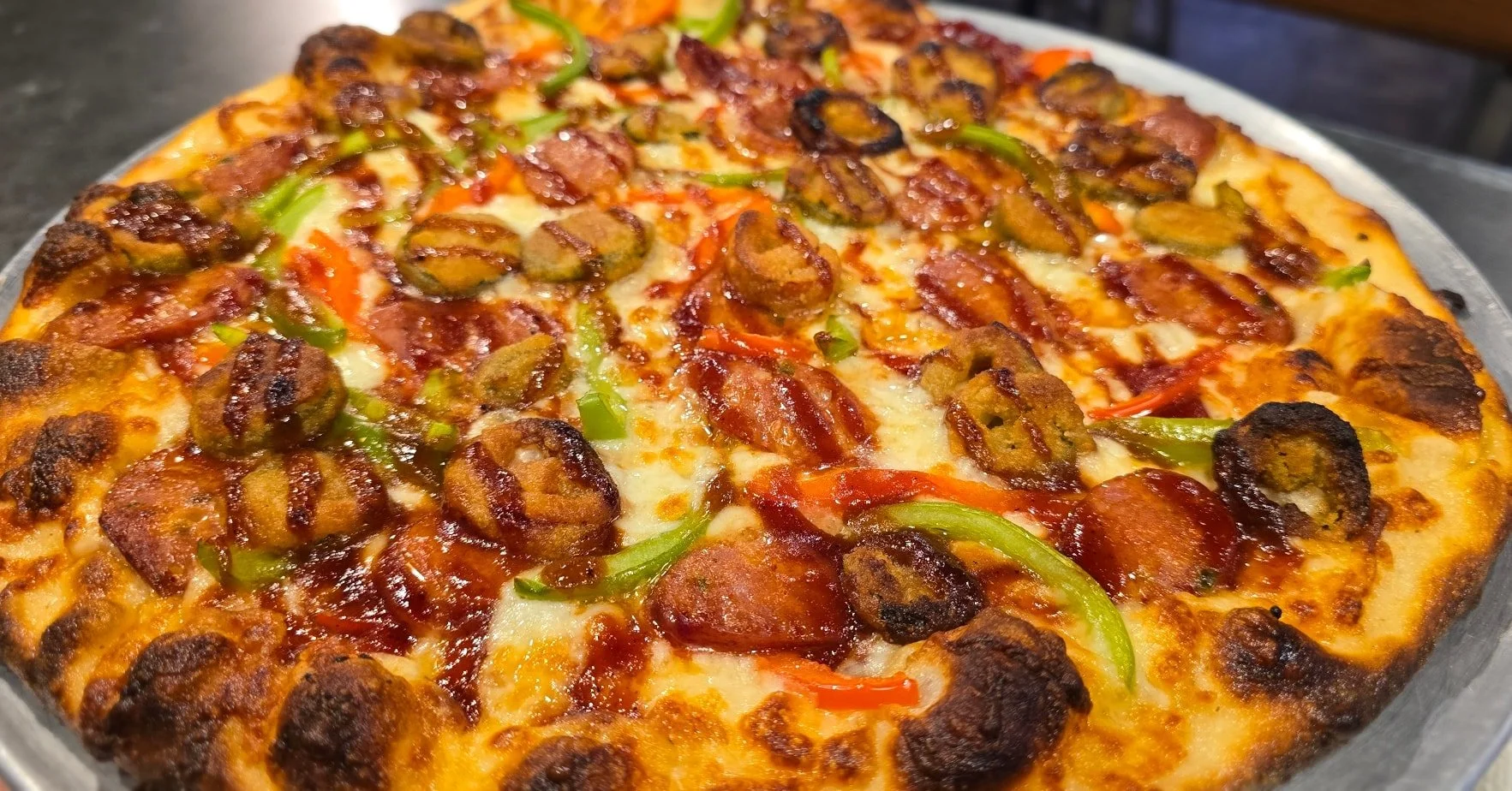 This sexy beast comes with Garlic and Olive Oil, Mozzarella, Red and Green Bell Peppers, Red and Green Battered Jalapenos, Redneck Brand Prairie Fire Sausage, Topped with BBQ. A PERFECT blend of sweet and spicy for your February LOVE FEST.